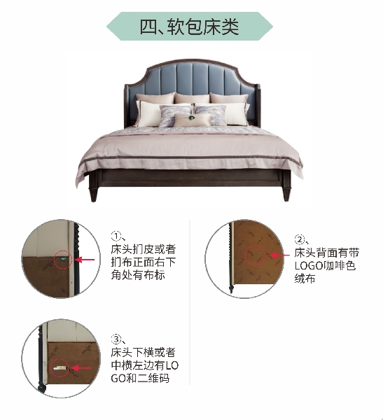 (1)床头下横或者中横左边有LOGO; 床头下横左边有防伪码。